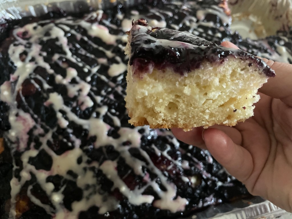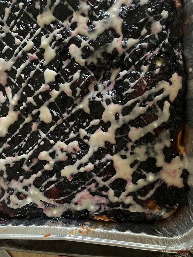 Spread cream cheese mixture over the batter evenly in the pan. Add the remaining cake batter from the bowl to cover cream cheese mixture completely. Top that mixture with the cooled off blueberry jam.