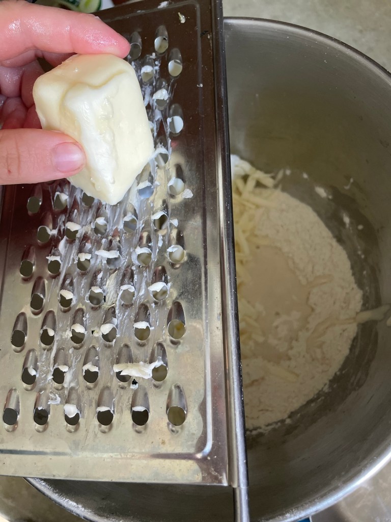 Combine flour, starter, sugar, salt, and water into a stand mixer or bowl. (I use a stand mixer with a paddle attachment.) Grate stick of butter into ingredients and mix together until just combined into a dough.
