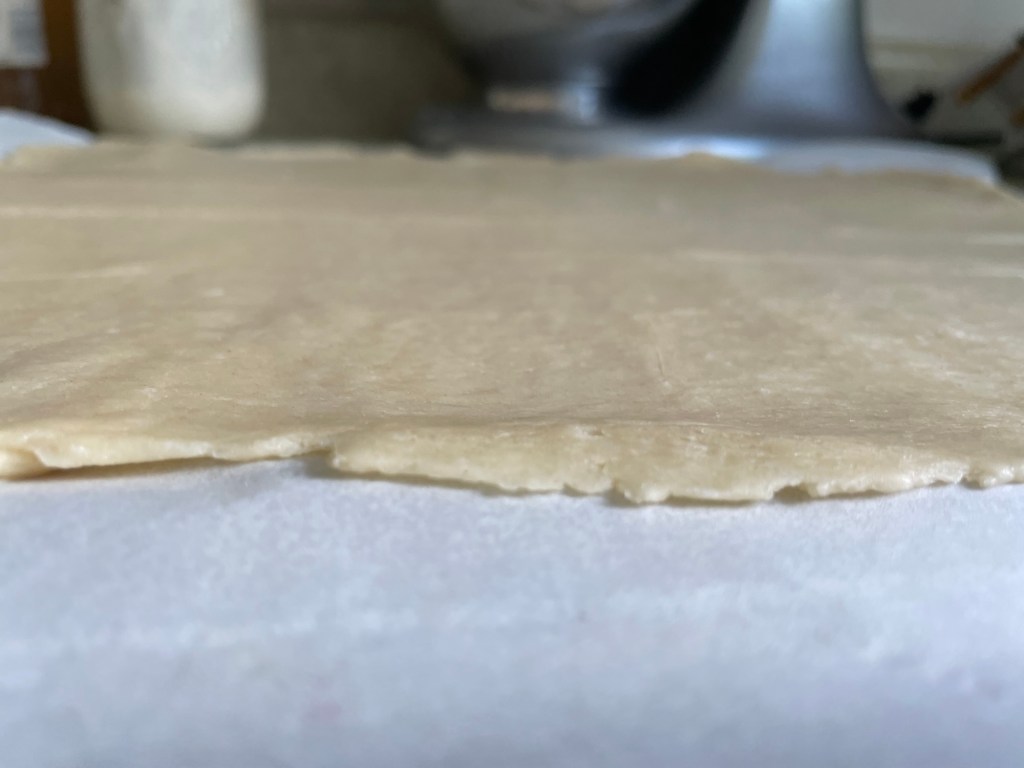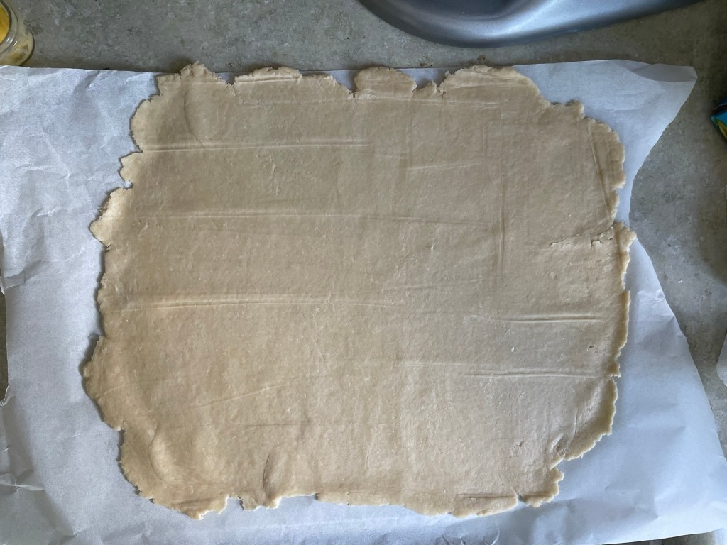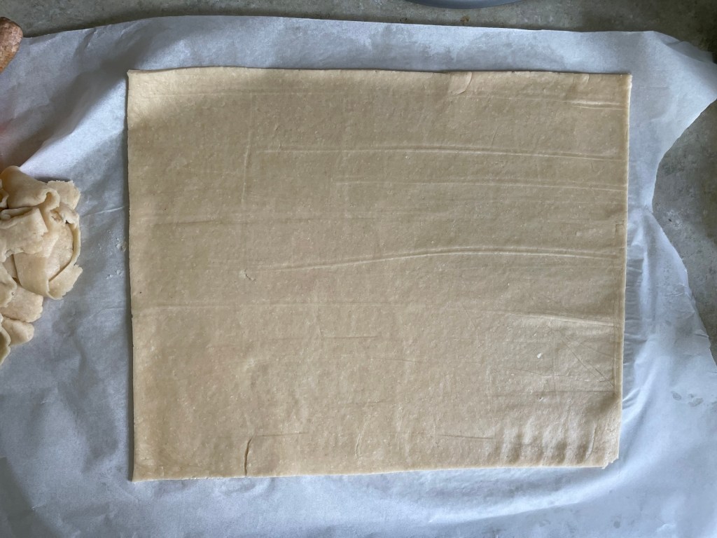Roll out dough onto a piece of parchment paper into a 12in by 14in rectangle. Trim the edges. Place the entire thing on a baking sheet and freeze for one hour.