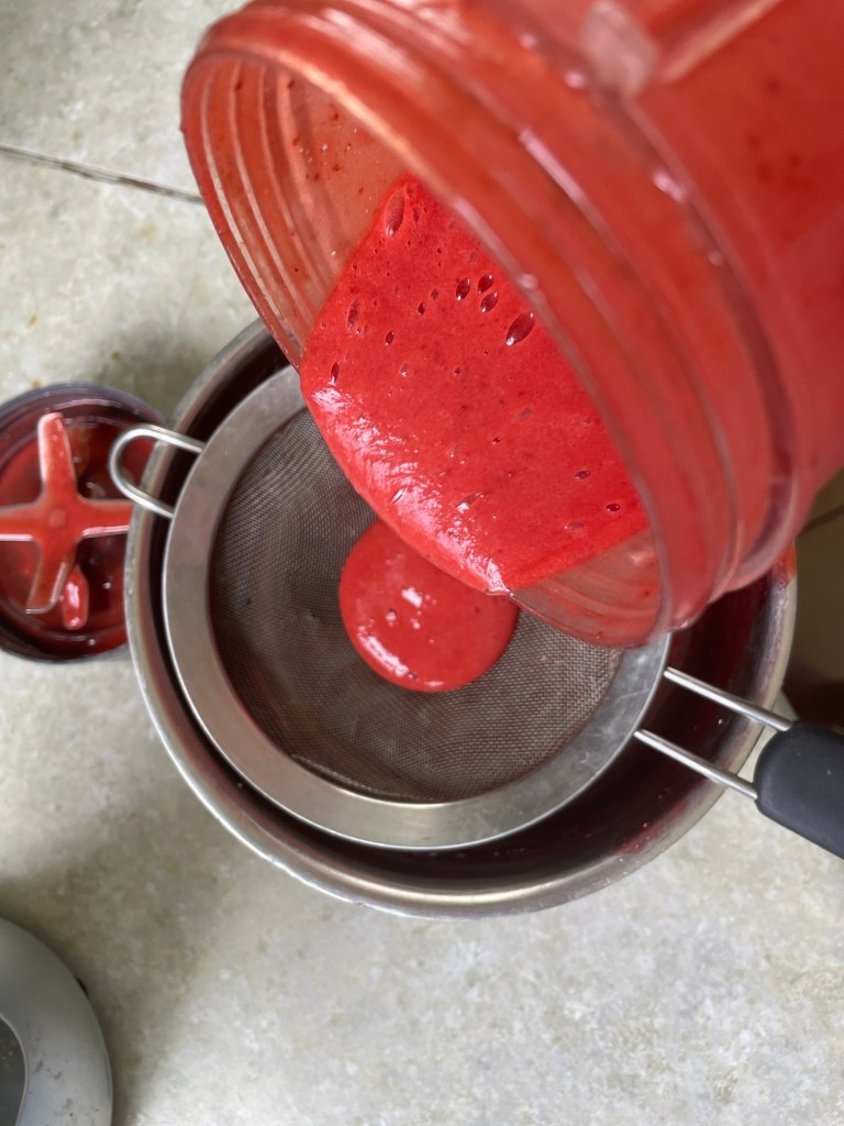 Place fine mesh strainer over saucepan and pour contents of blender into the strainer. Stir until all liquid is in the saucepan and seeds are removed.