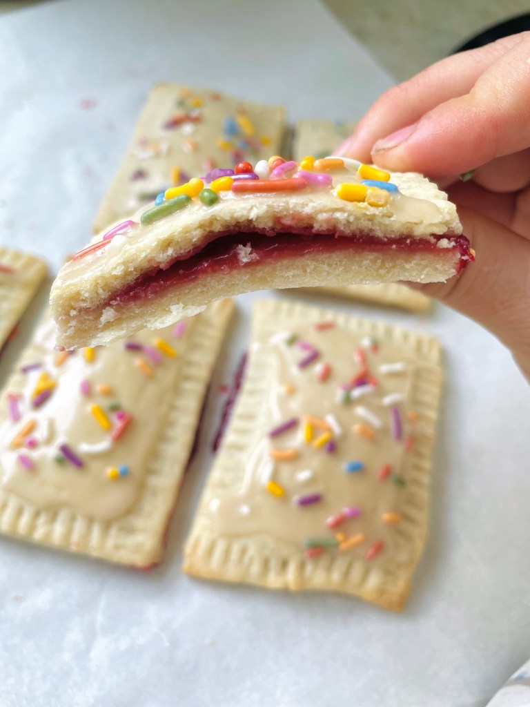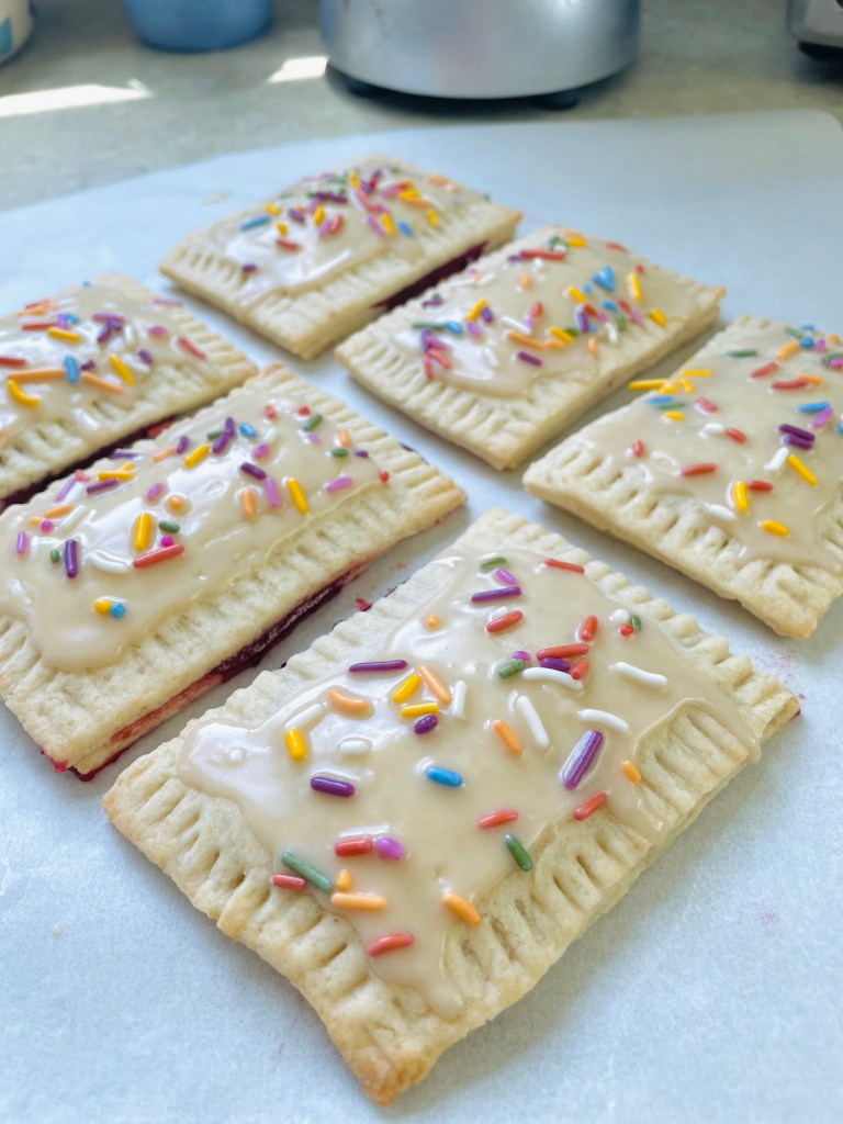 Mix together ingredients for icing. Spoon a small amount onto each poptart and spread to the creased edges. Top with sprinkles, if desired!