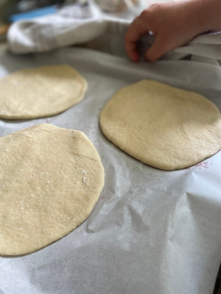 Flour surface and roll each individual ball until it is flat and about 1/8th inch thick. Put the pita circles on three different pieces of parchment paper.