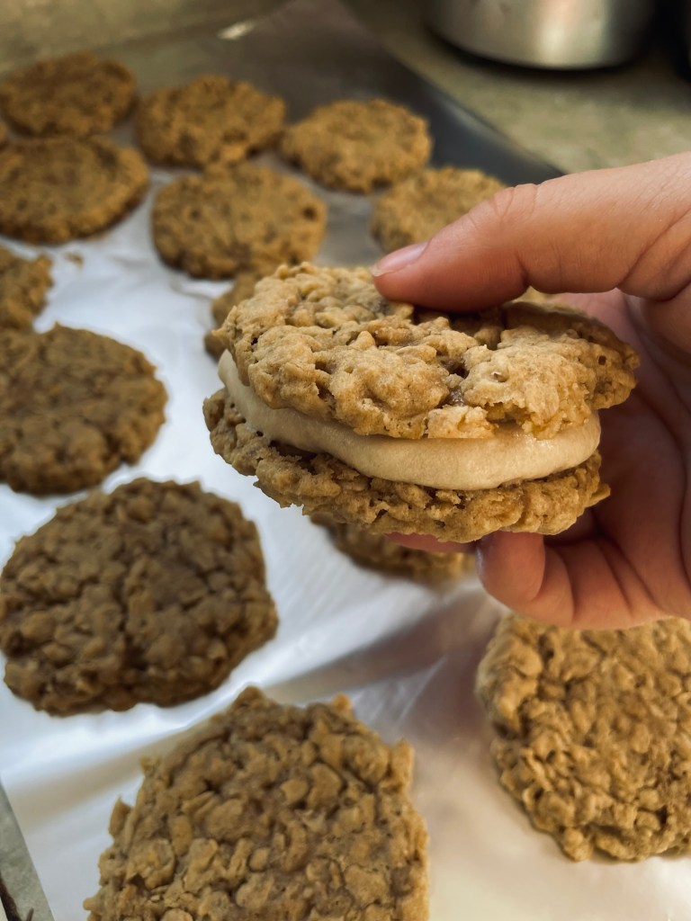 Slather filling onto cookie and top with another, repeating until all cookies are sandwiched!