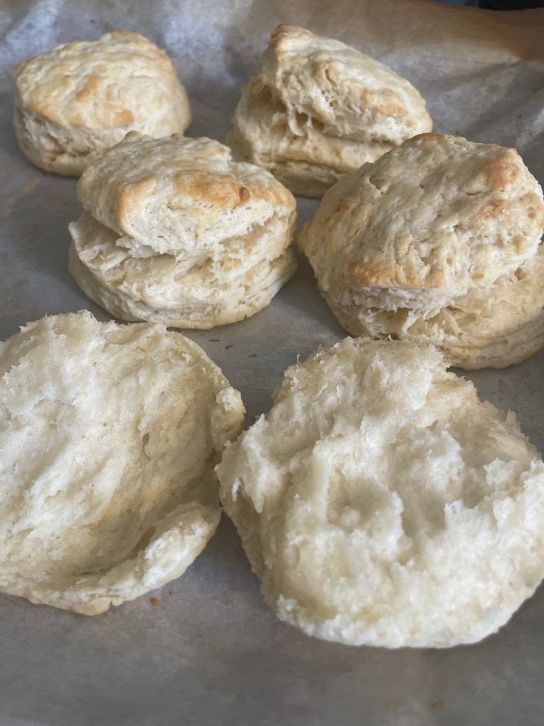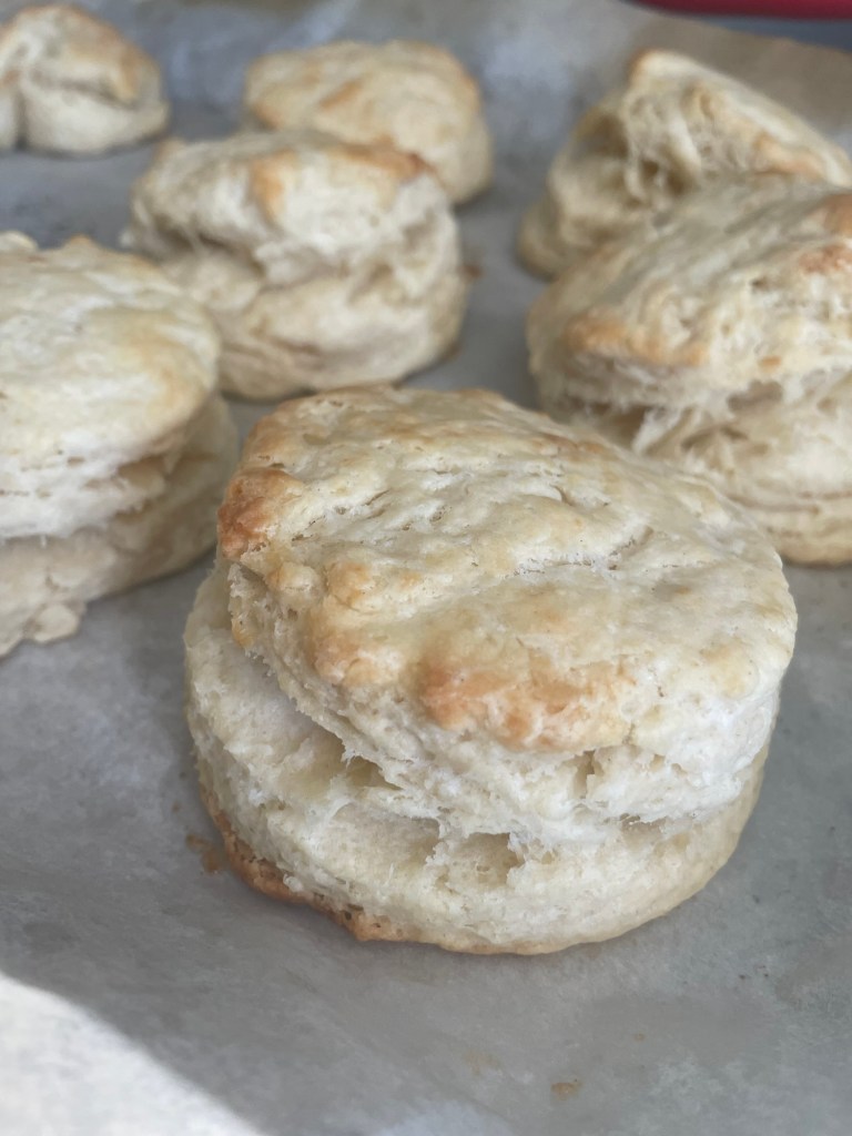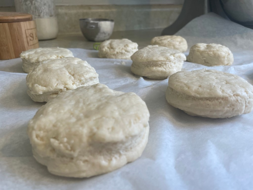 After all biscuits are cut out, place sheet of parchment on a baking sheet.